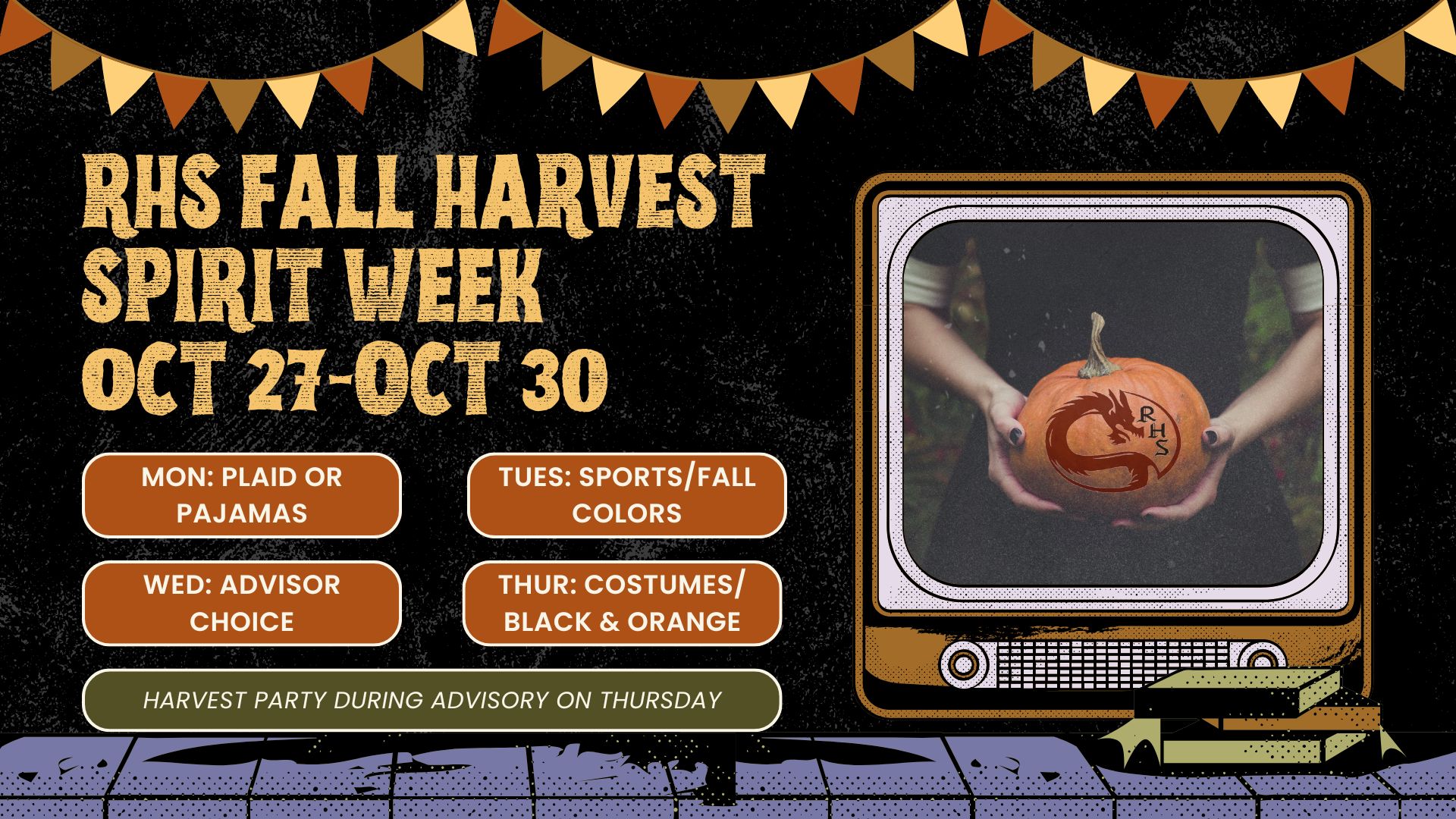 Spirit Week for all in-person students. Monday: Plaid or PJ Day Tuesday: Sports/Fall Colors Wednesday: Advisor Choice Thursday: Costume/Black & Orange