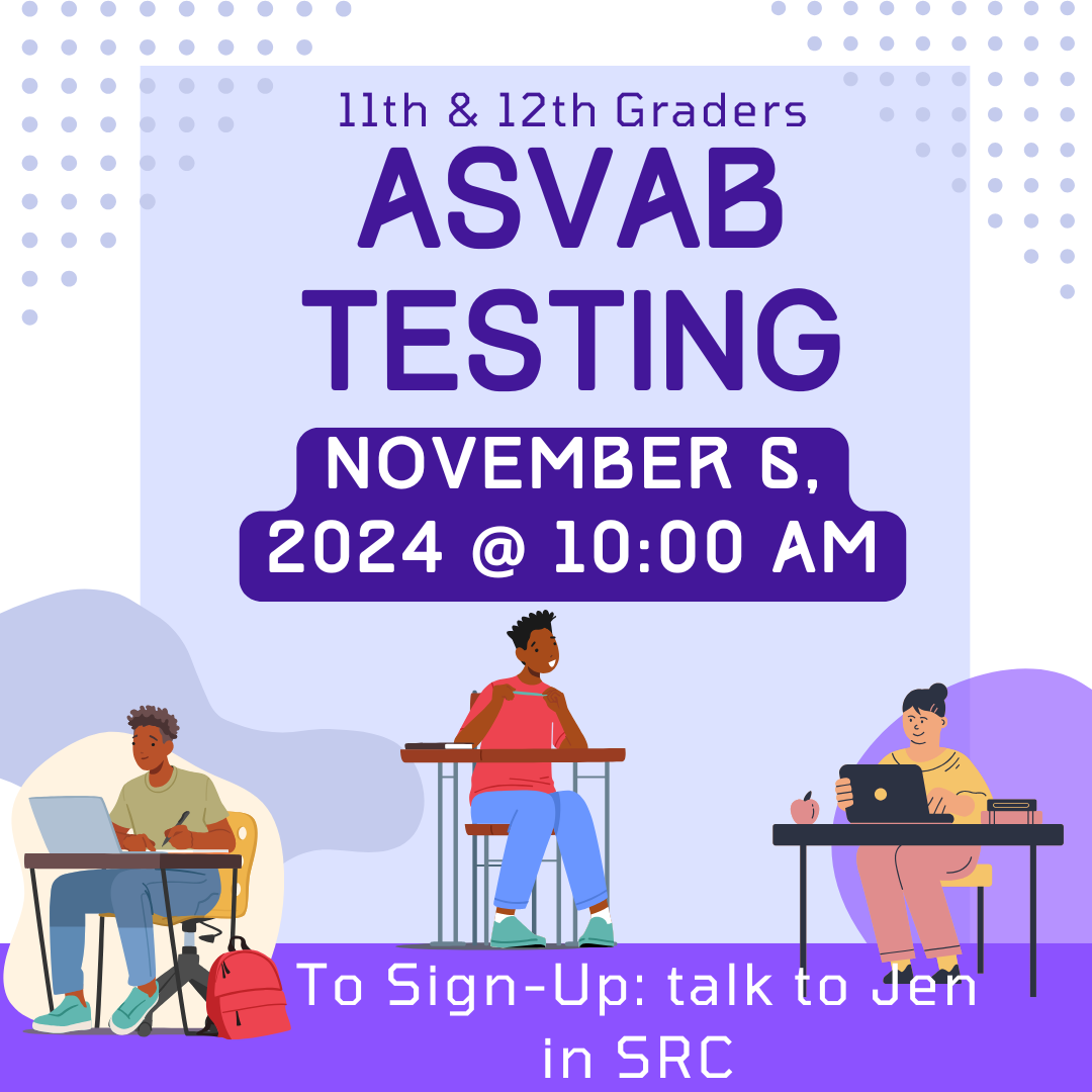 ASVAB TEST TOMORROW, WEDNESDAY NOVEMBER 6TH, 2024 STARTING AT 10AM.